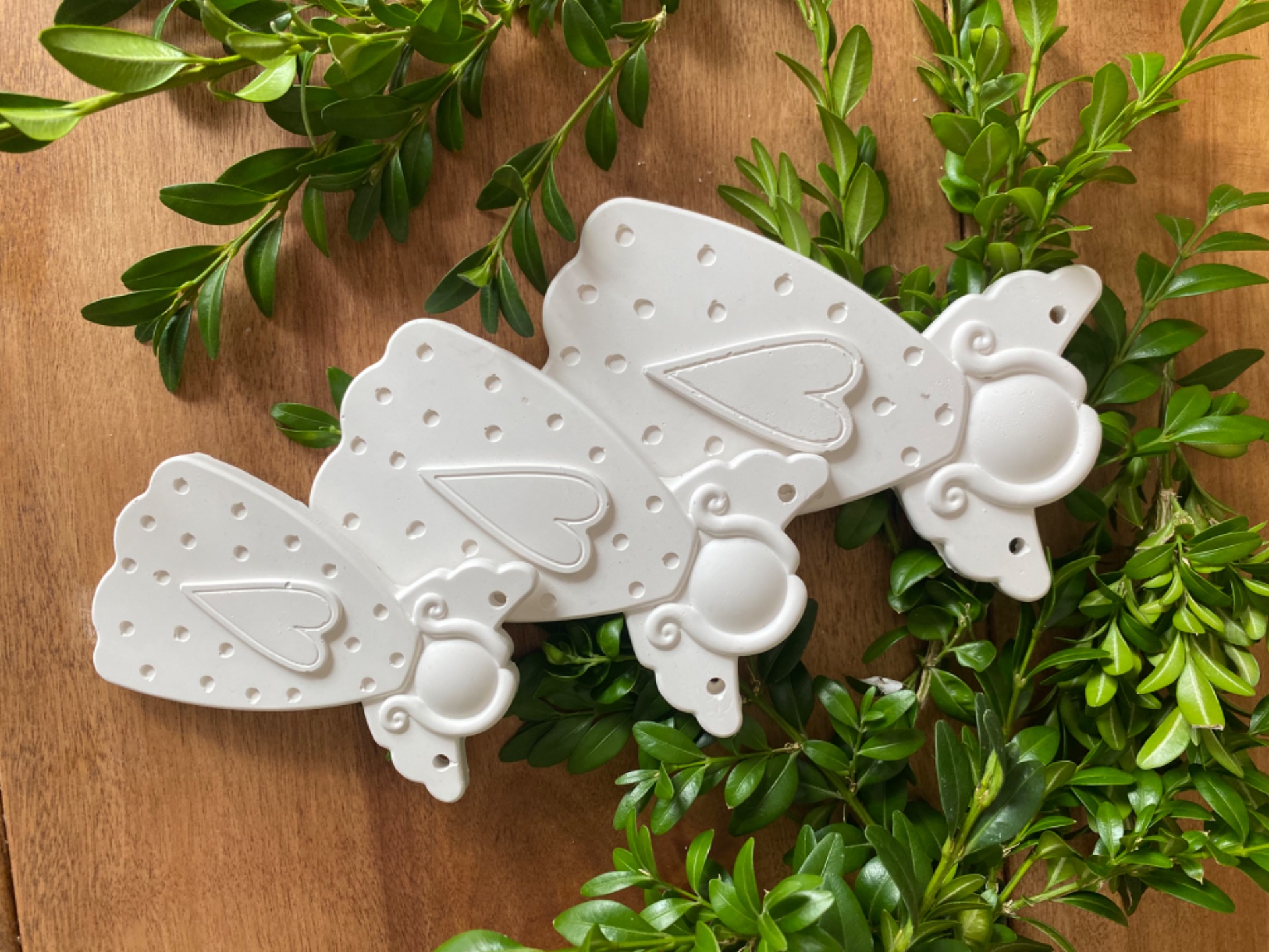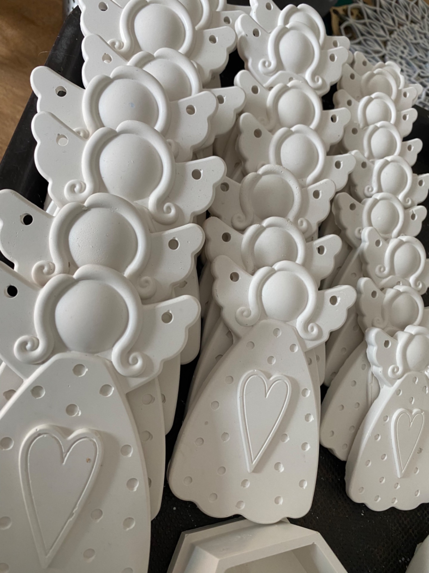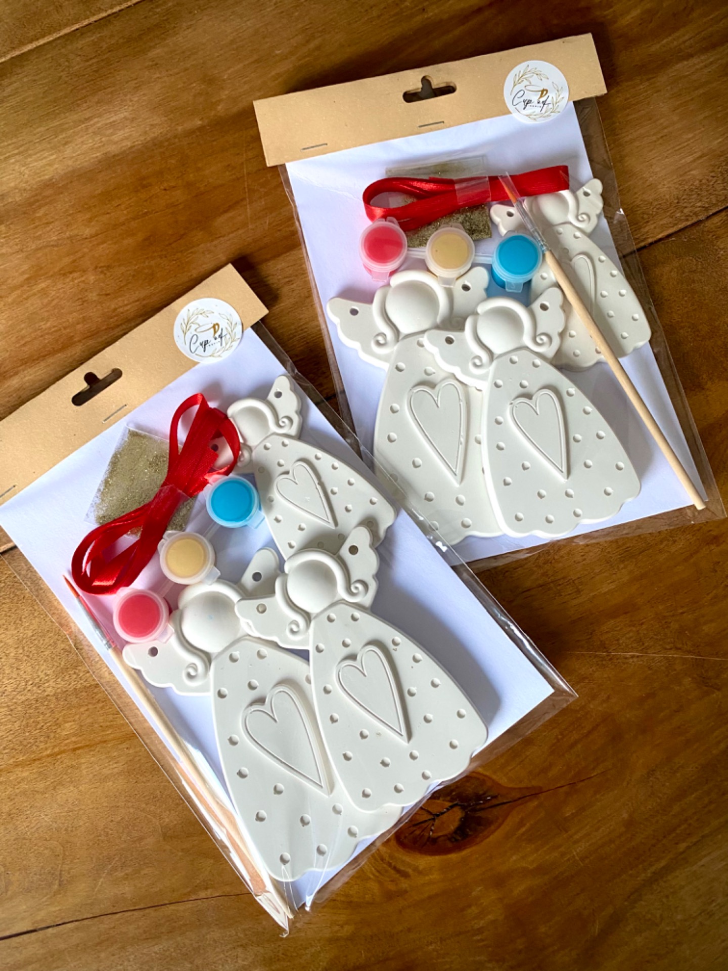 Balíček pro tvoření, který obsahuje sádrové odlitky, akrylové barvičky, štětec, třpytky, stuhu.