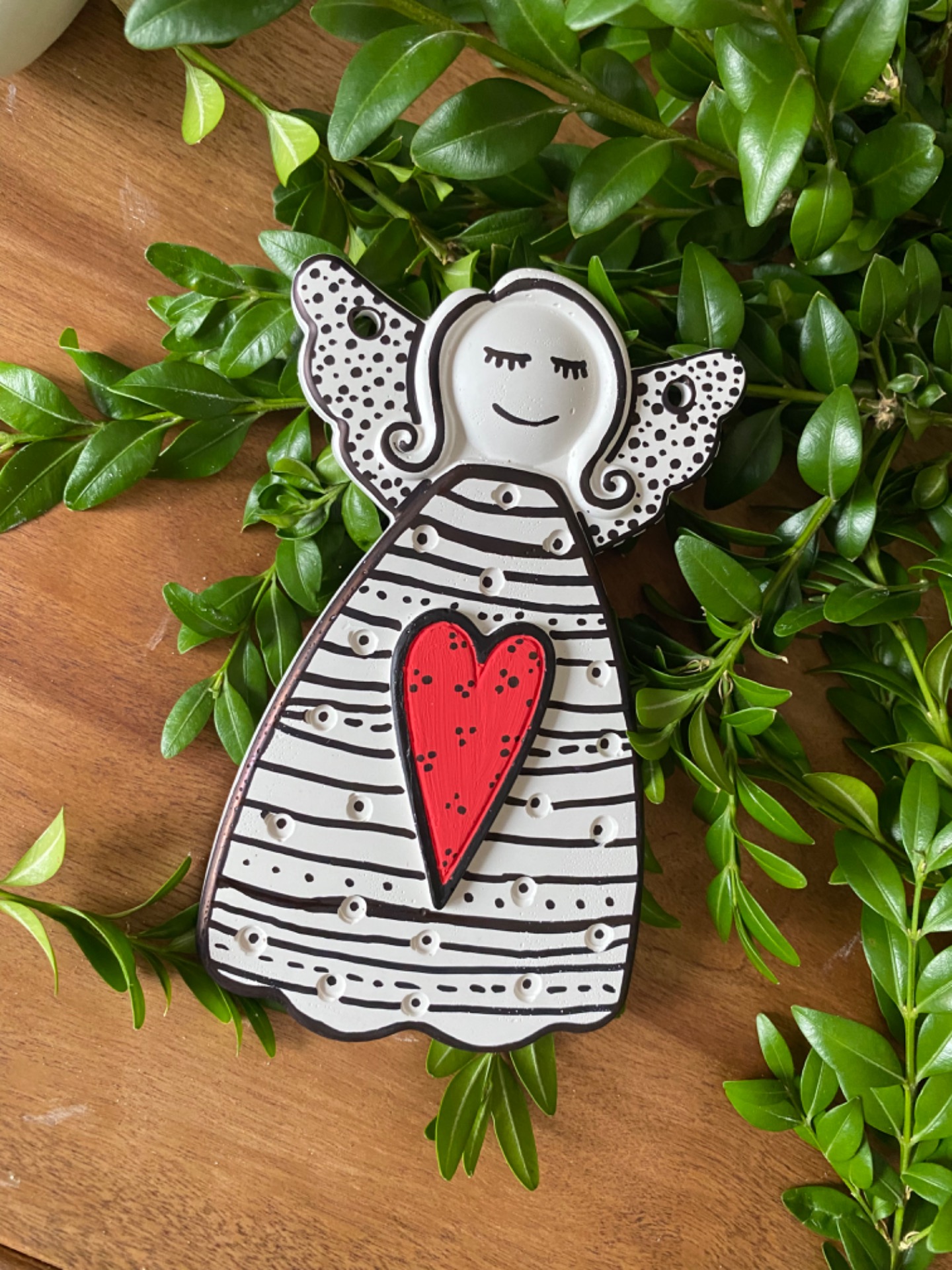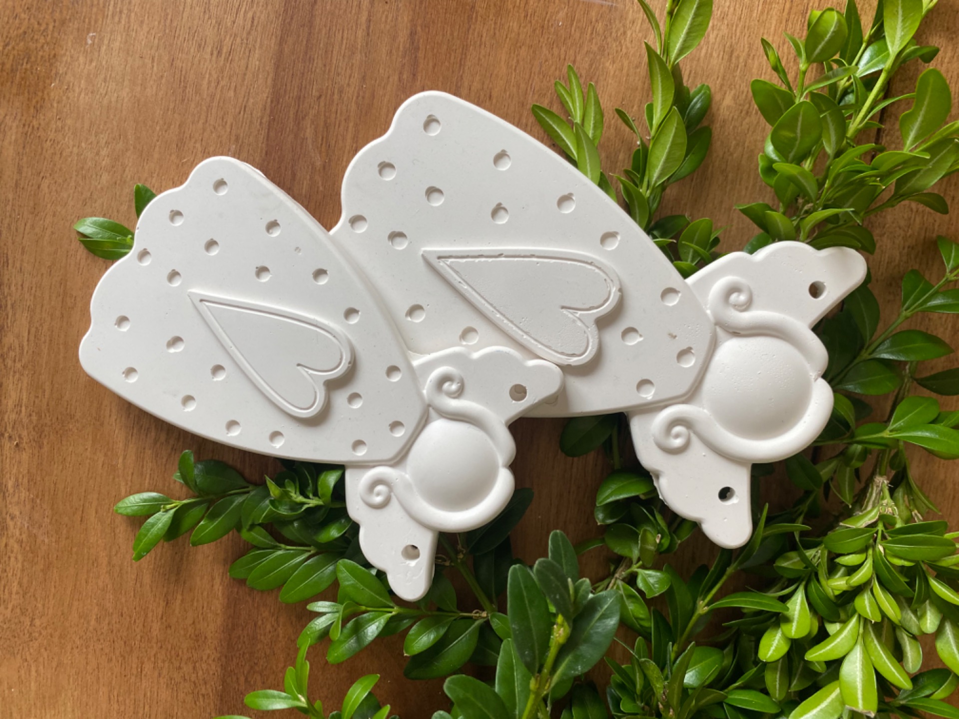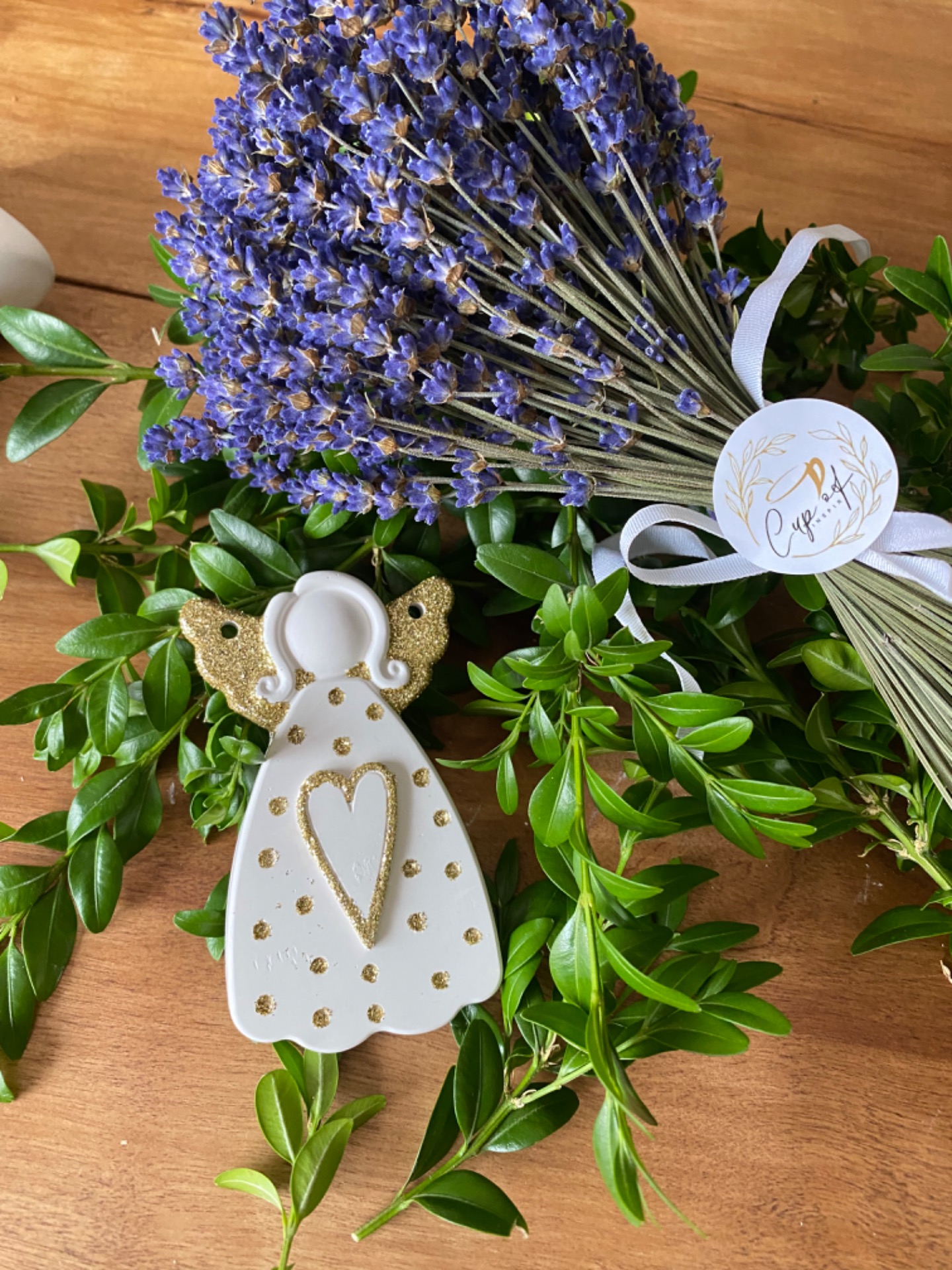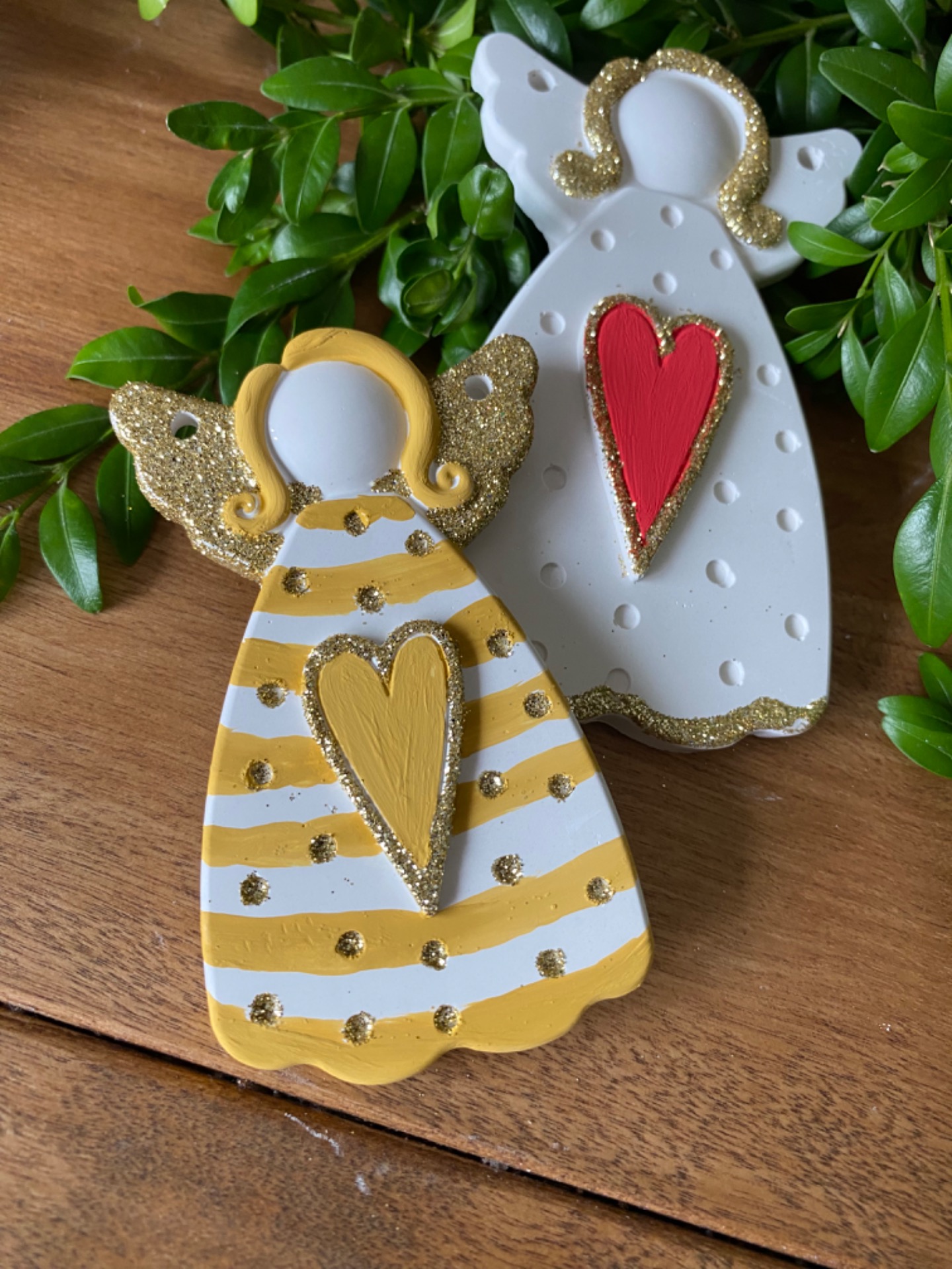 Balíček pro tvoření, který obsahuje sádrové odlitky, akrylové barvičky, štětec, třpytky, stuhu.