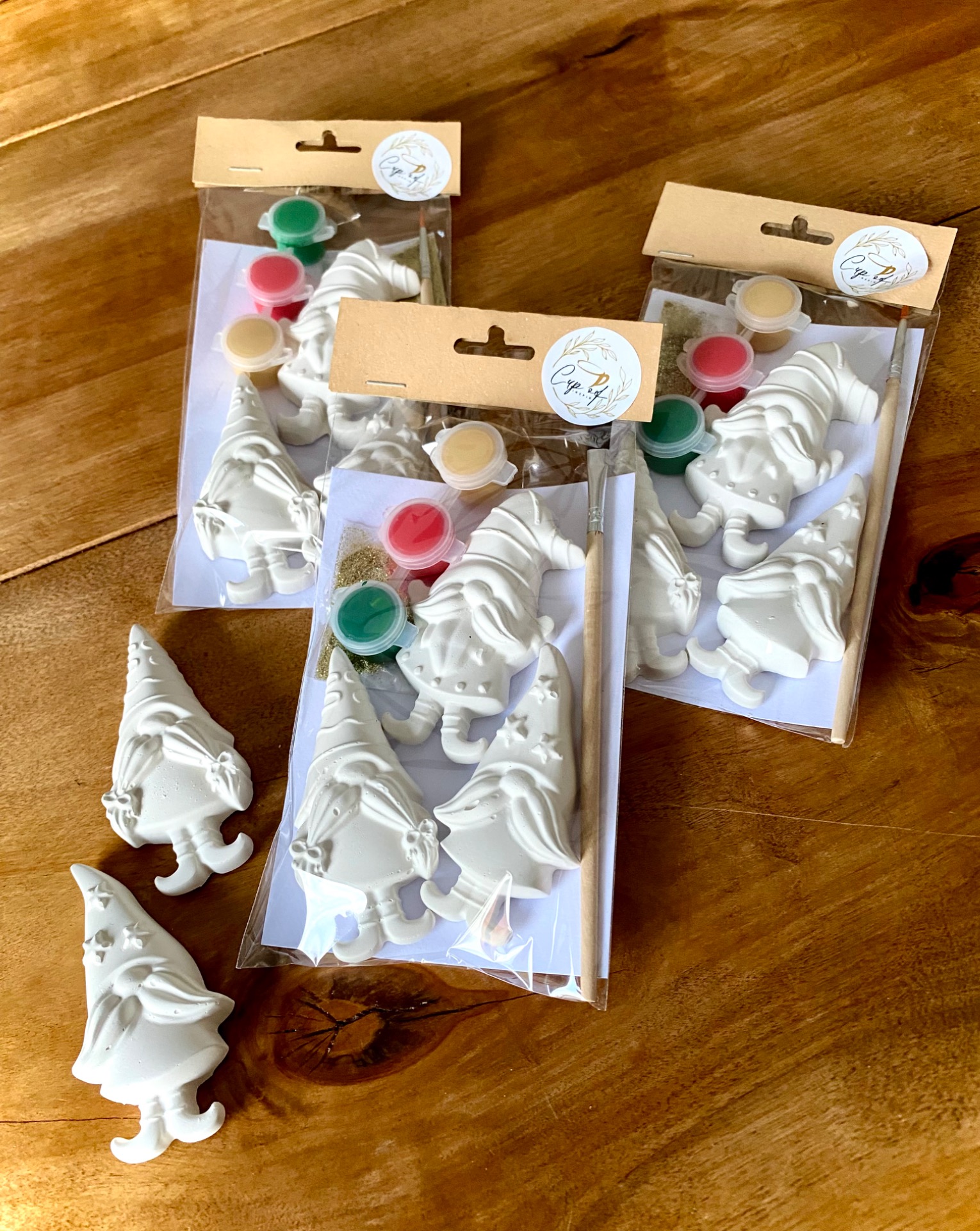 Balíček pro tvoření, který obsahuje sádrové odlitky, akrylové barvičky, štětec.
