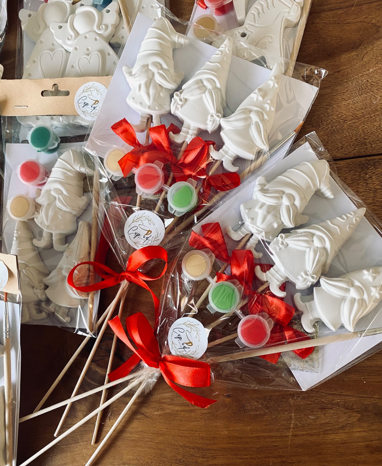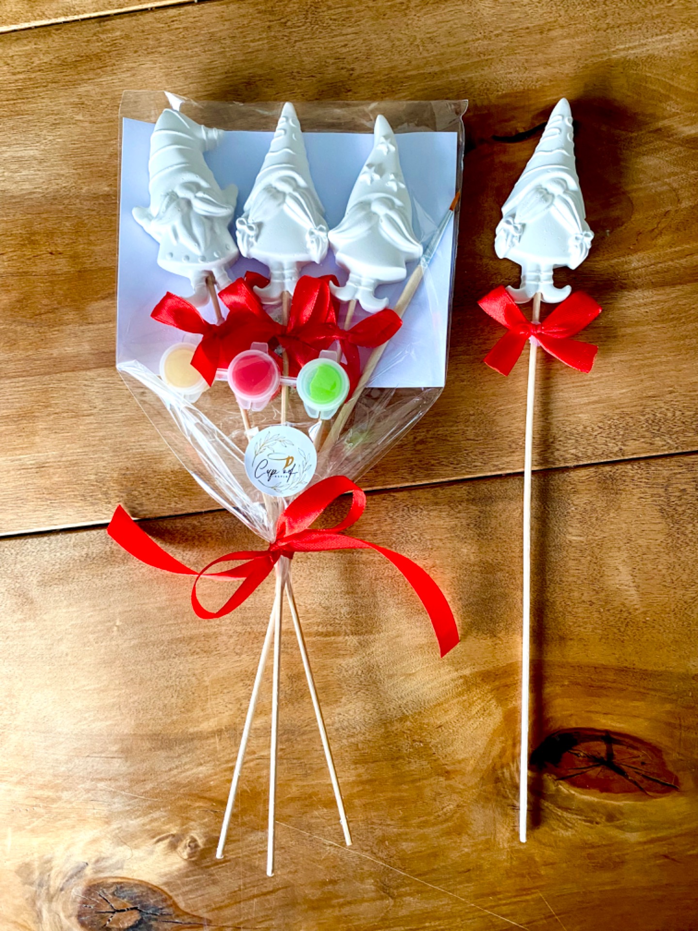 Balíček pro tvoření, který obsahuje sádrové odlitky skřítků na dřevěné špejli, akrylové barvičky, štětec.