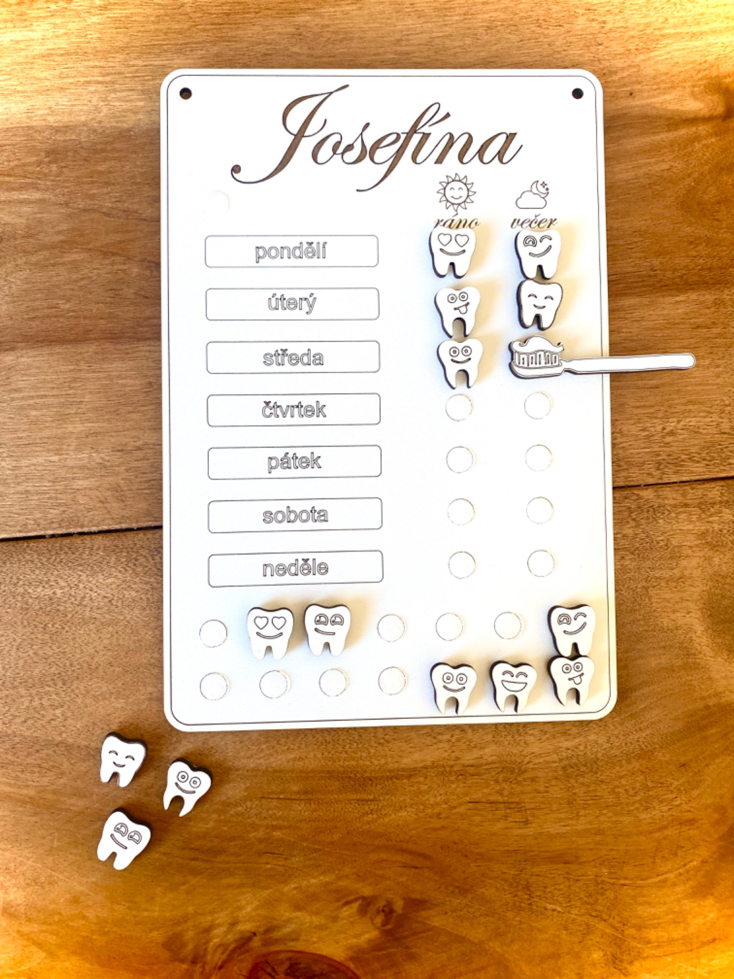 Tabulka má 1 zubní kartáček a 14 zoubků, které na tabulce drží díky suchému zipu.